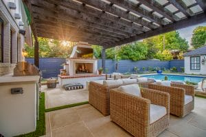 By connecting your outdoor area to your indoor living space, you can create an environment that feels like a natural extension of your home. These double doors lead out to a patio with a fireplace, cooking amenities, and plenty of seating for all. The white pergola shields the outdoor elements but allows light to flow through and creates a sense of spaciousness.